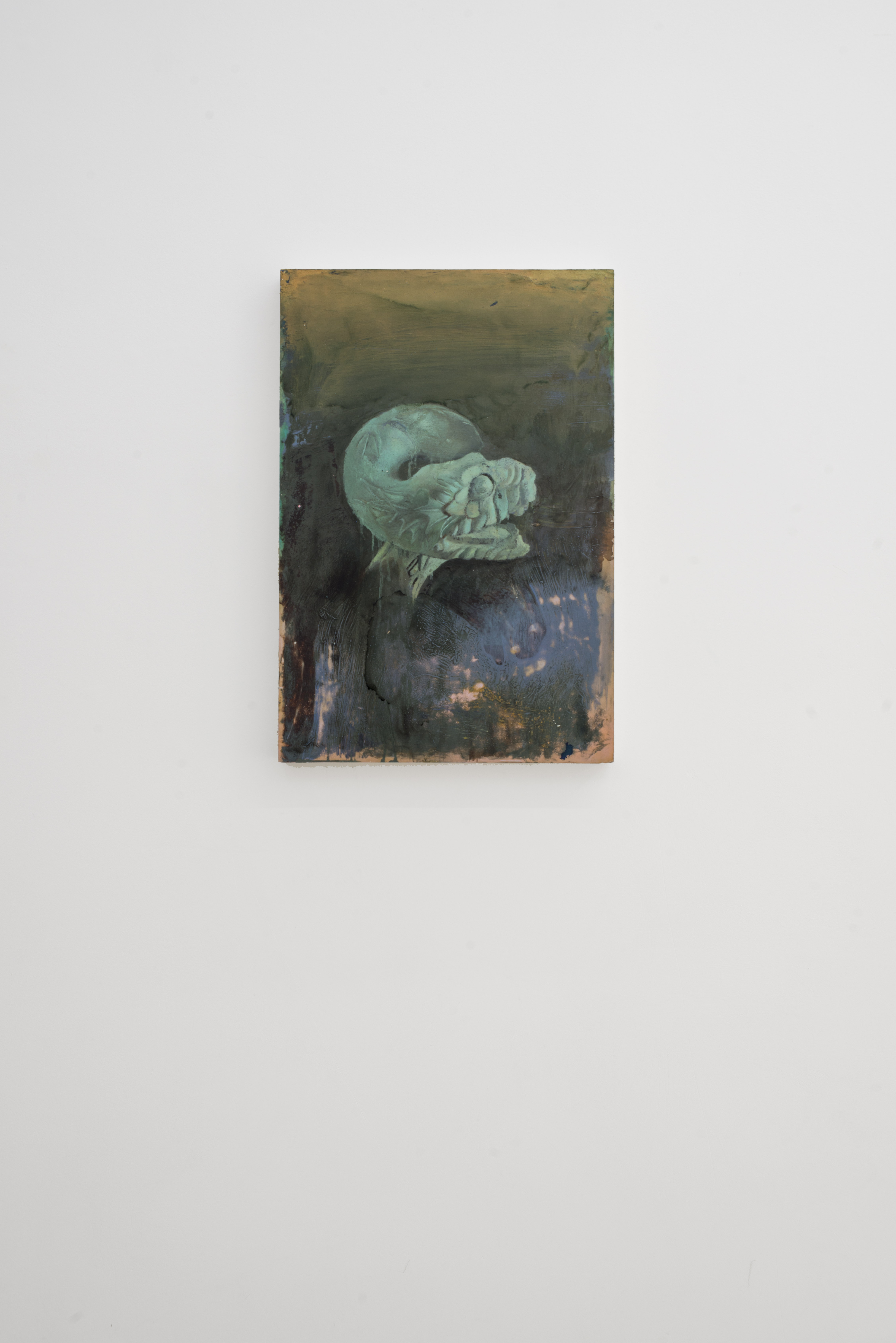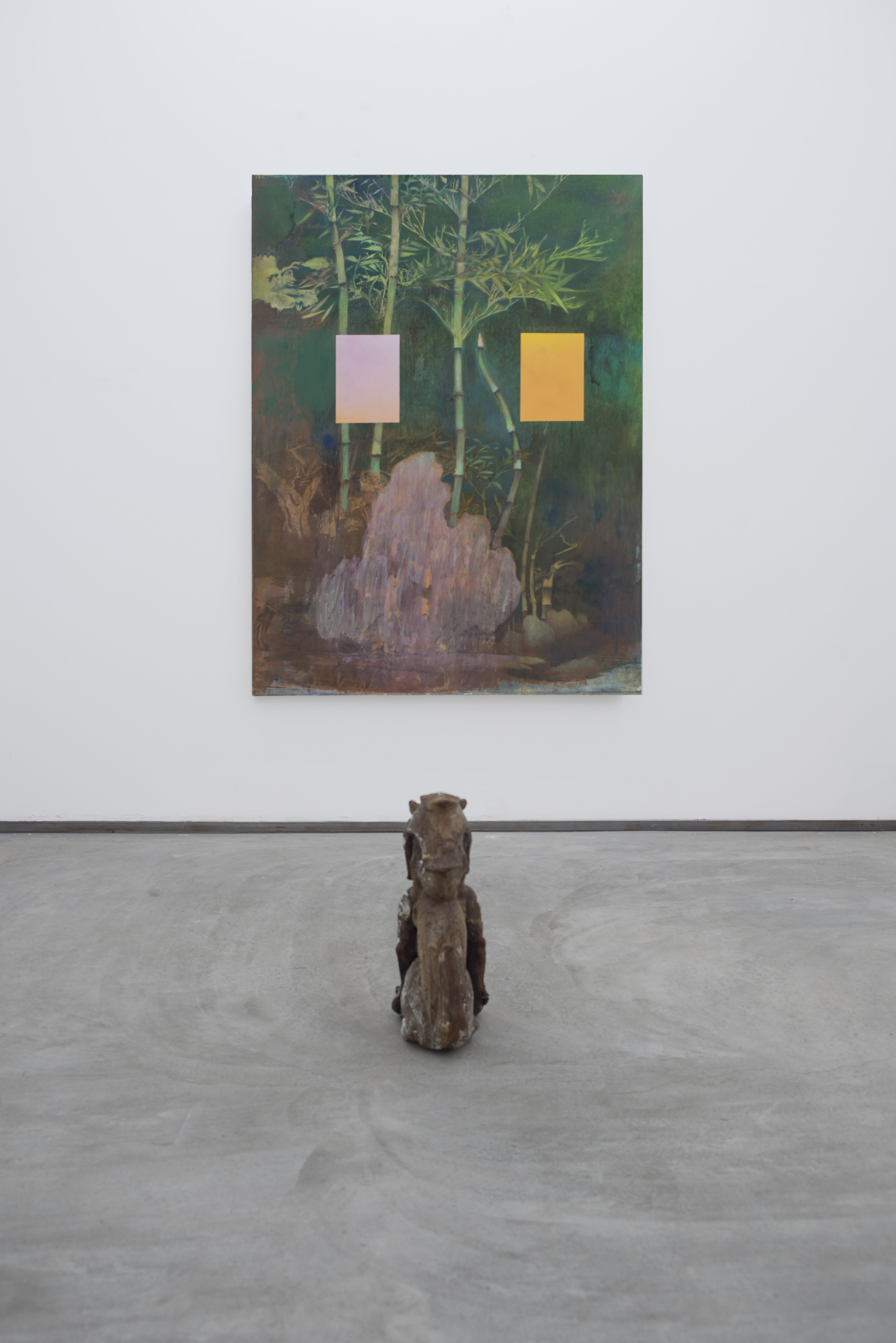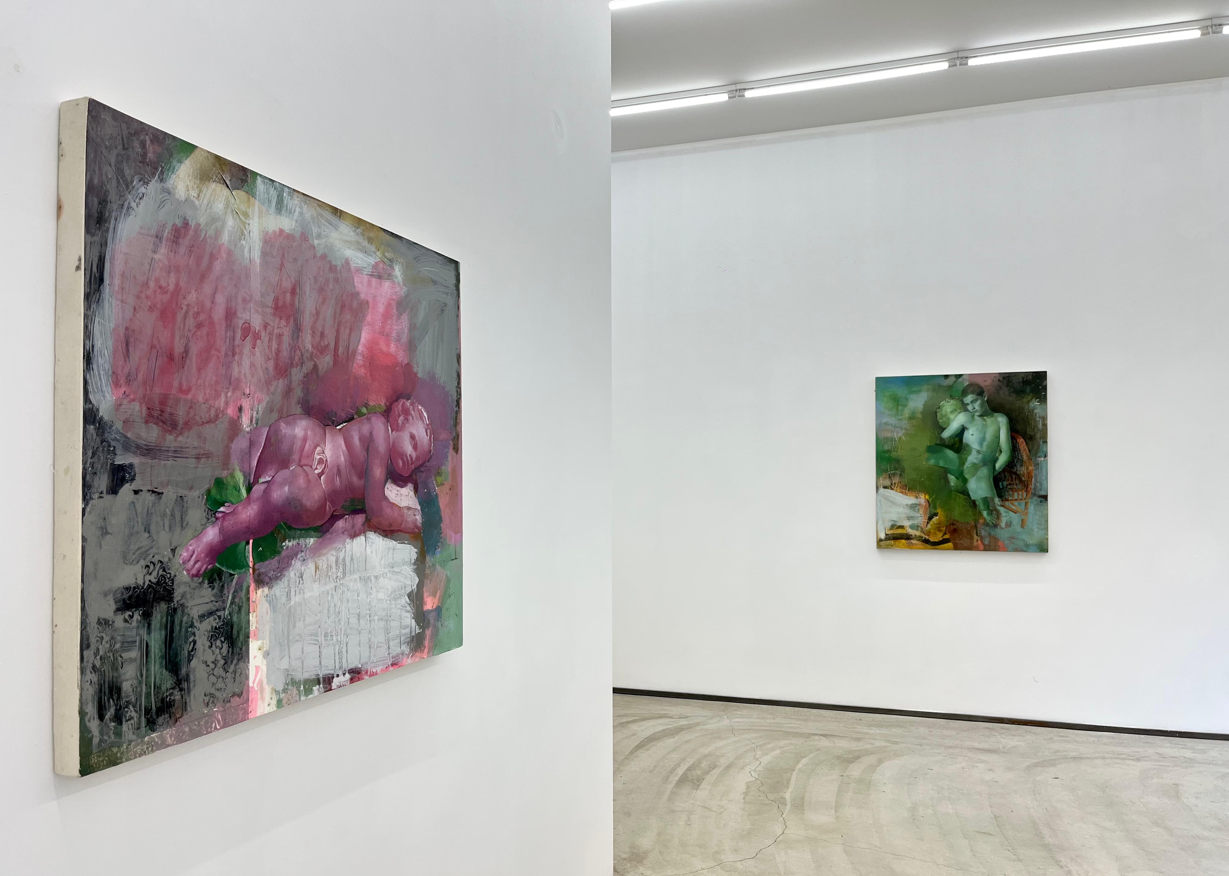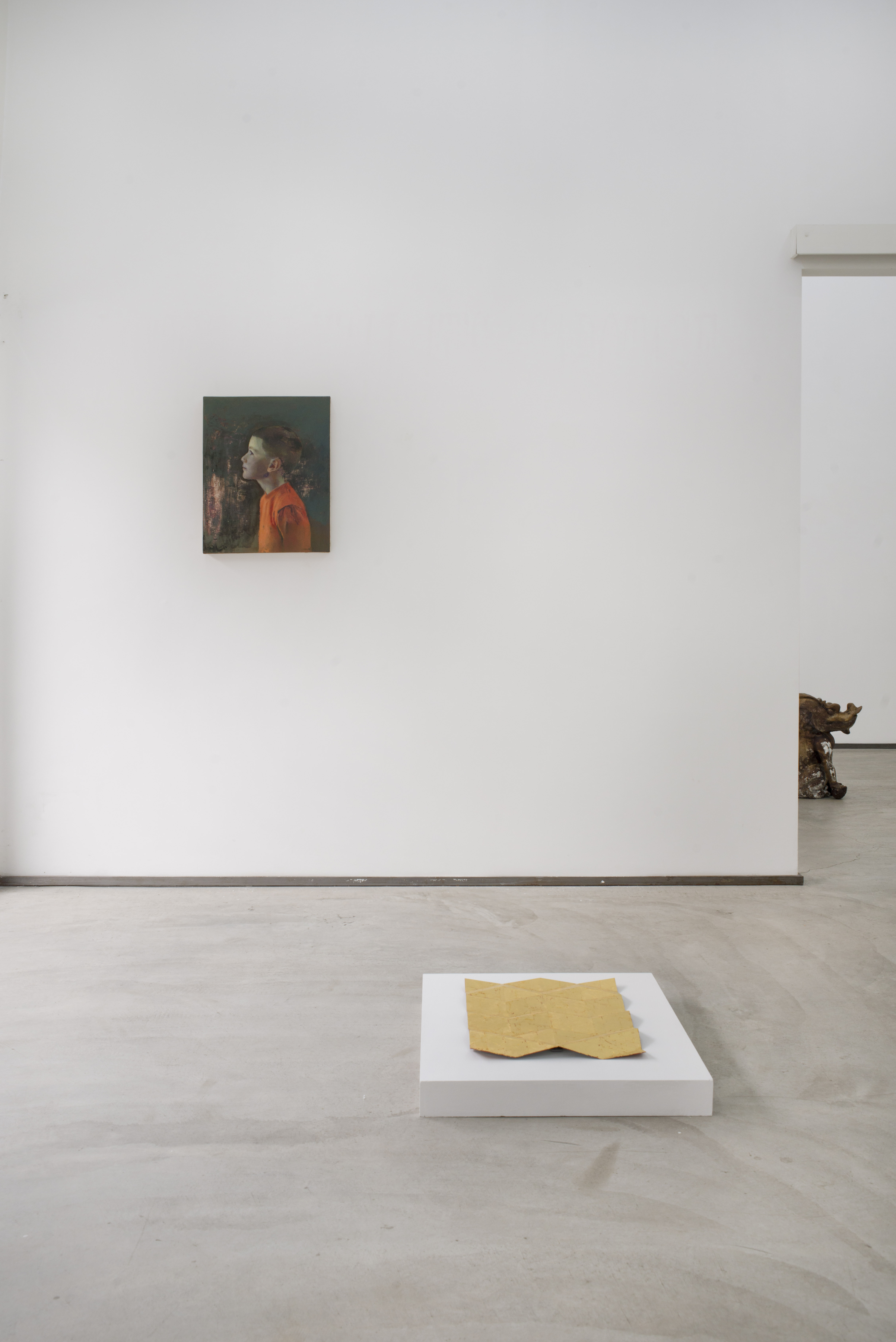 Moving between painting and sculpture, the artist’s practice unfolds as a series of transformations: in Putto and Self-portrait as a Young Man (Pyromaniac), bodies bend and dissolve; in Roses Bar and Lovers, intimate gestures are captured at the moment just before their full realization; while in Portrait with Flowers, the portrait escapes definition. At times, human figures withdraw, giving way to animals, hybrid forms, and presences suspended between vision and disappearance (Garden Deer, Auspicious Beast, Night Bamboo). In the sculptural works Philharmonie and Prussian’s Breast, the figure vanishes entirely, revealing a distinctly Berlin character made of layers and references—the titles, the architectural echoes of Scharoun’s concert hall, and materials such as copper that, with time, change color, like the city’s rooftops. Cuts and joints here resemble slits or fragile seams.